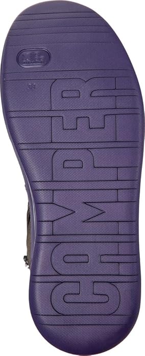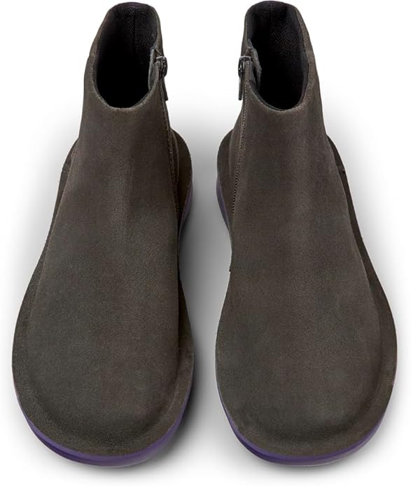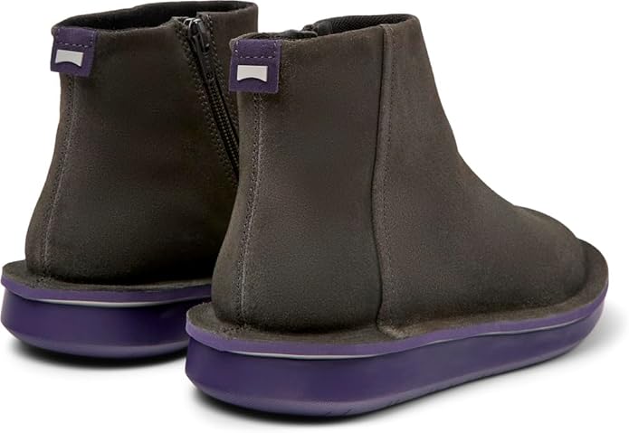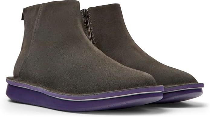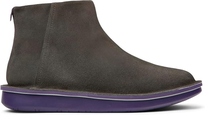 Grey nubuck ankle boots for women with lightweight purple outsoles.